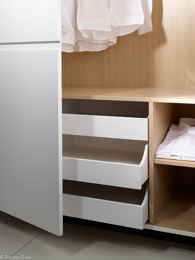Er darf auf keinen Fall im Schlafzimmer fehlen – der Kleiderschrank. Er sollte ausreichend Stauraum für die unterschiedlichen Kleidungsstücke bieten. Daher ist nicht allein die Optik wichtig, sondern auch die Aufteilung und das Schranksystem selbst. Überlegen Sie sich am besten im Vorfeld, welche Kleidungsstücke Sie unterbringen möchten und welche Schranktüren (Schiebetür oder Drehtür) Sie bevorzugen. Davon ausgehend gestalten wir gemeinsam mit Ihnen das Innensystem des Schranks. Egal ob Dachschräge, hohe Wände oder kleine Nische – wir finden die optimale Lösung und passen den Schrank perfekt an den vorhandenen Raum an. Gerade bei Kleiderschränken macht es Sinn, die Raumhöhe auszunutzen. Entsprechende Kleiderlifte helfen dann dabei, die oberste Schrank-Etage zu erreichen.